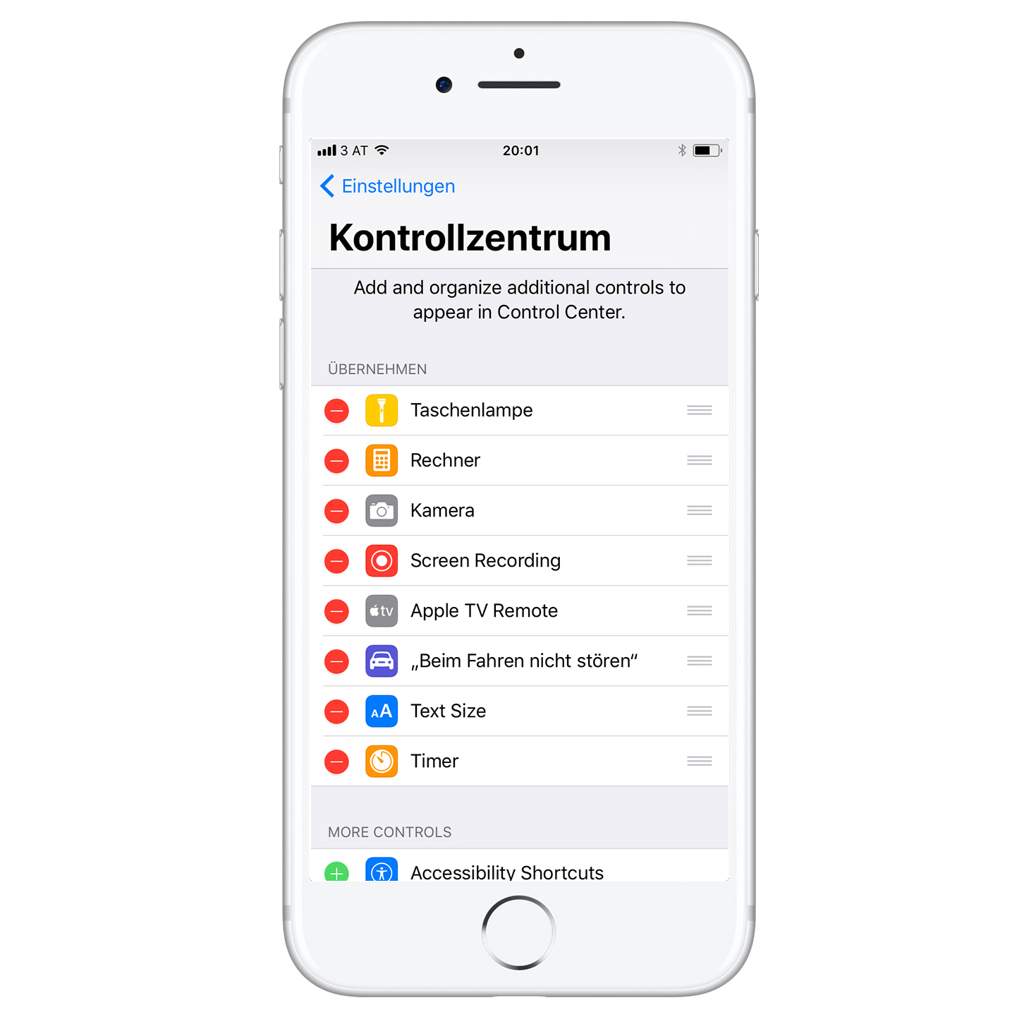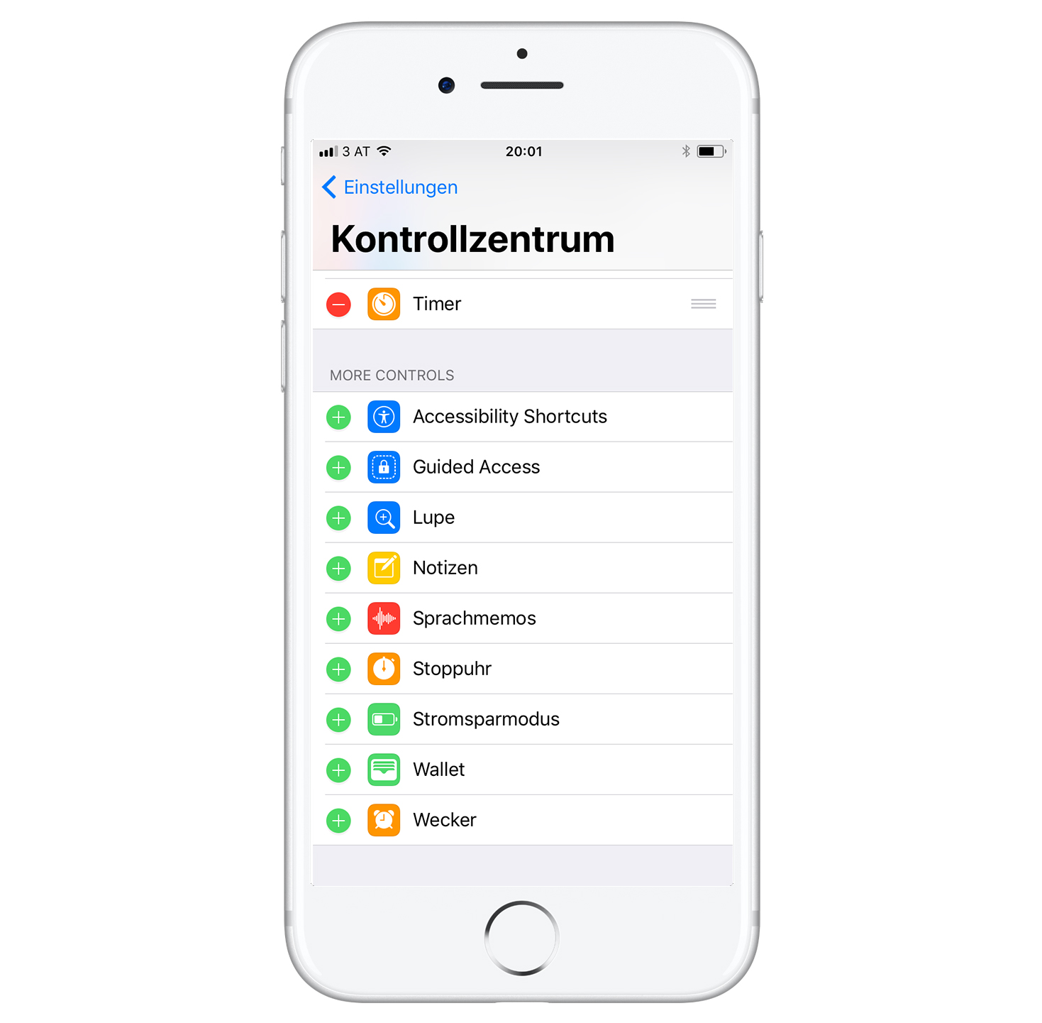 In den Einstellungen kann man die verwendeten Buttons im Kontrollzentrum anpassen, verschieben oder ganz entfernen. Die Einstellungsmöglichkeiten, welche sich oben links in einem „Ordner“ befinden kann man jedoch nicht anpassen, da diese festgelegte Funktionen beinhalten die aber ganz praktisch sind.