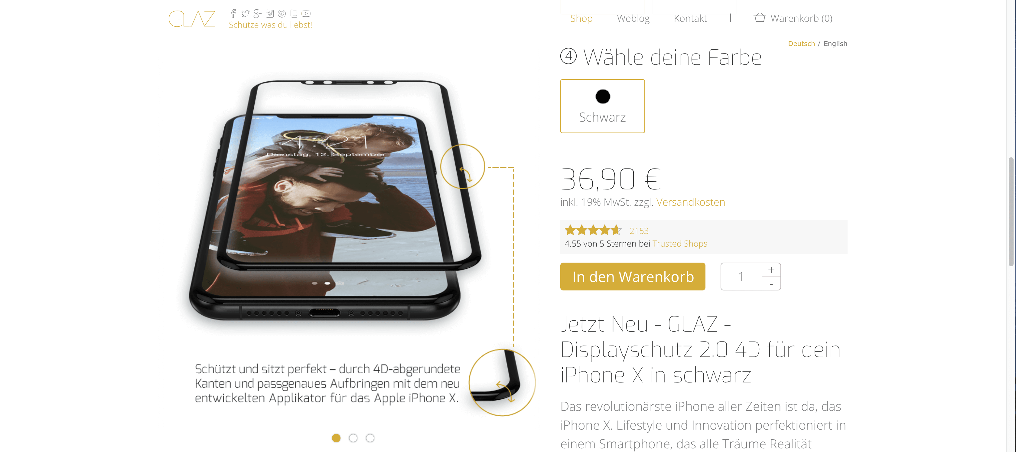 Hinweis: Wir haben GLAZ nicht bezüglich dieses Problems kontaktiert. Allerdings ist das Problem anscheinend bei dem GLAZ Displayschutz weit verbreitet, wenn man sich die Facebook Kommentare durchliest. Im Test war der GLAZ Displayschutz 2.0 4D in schwarz (bestellt am 9.12.2017).