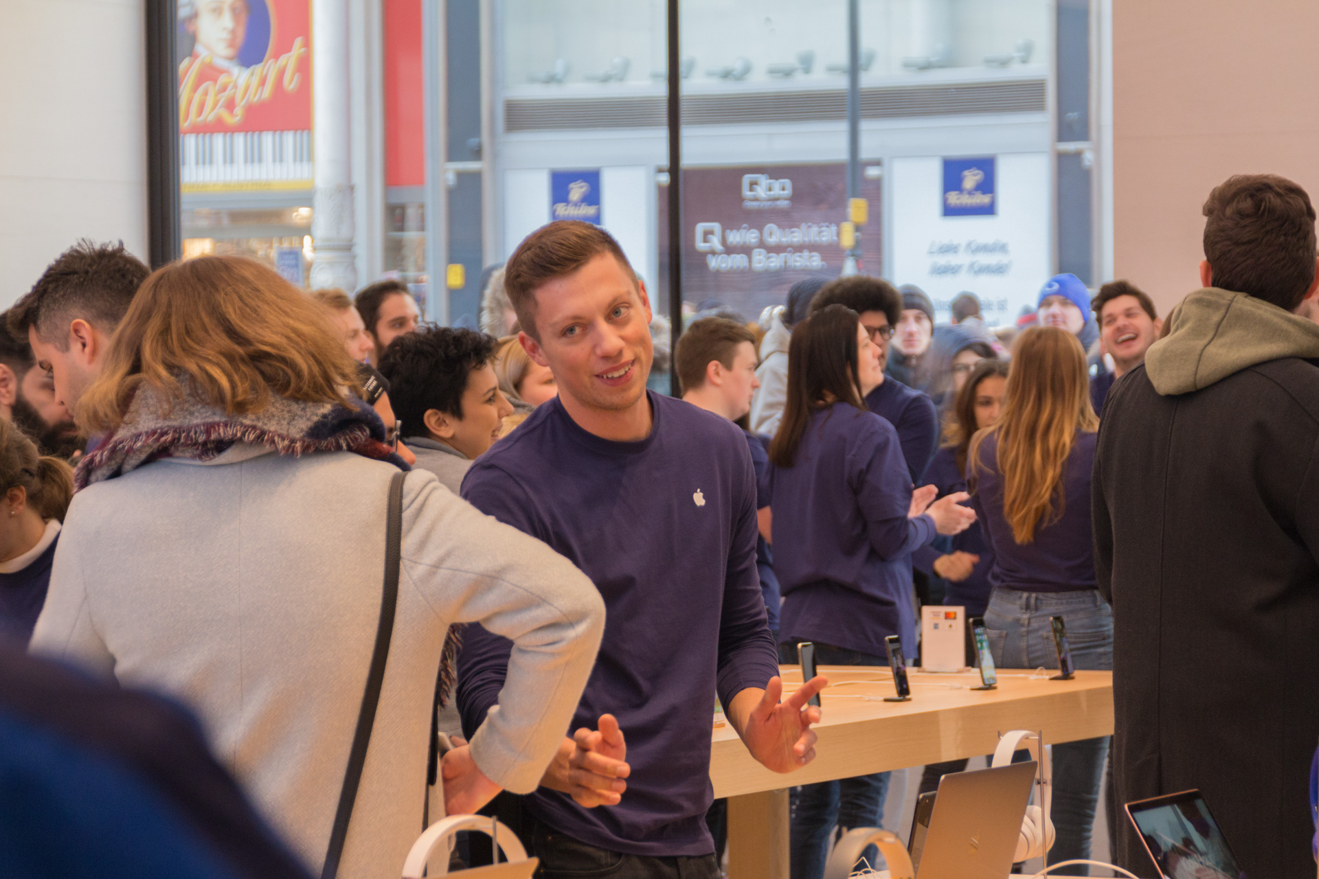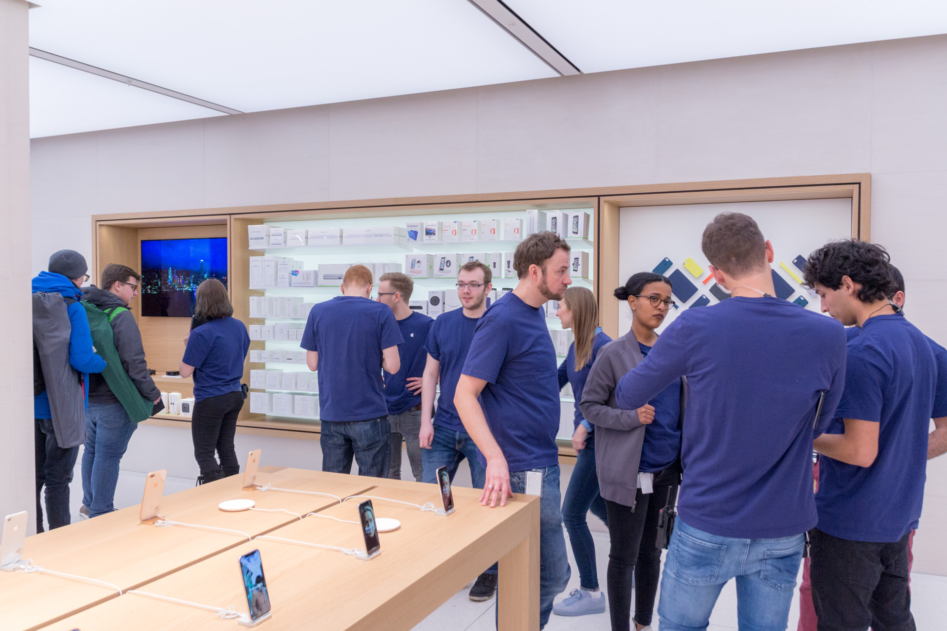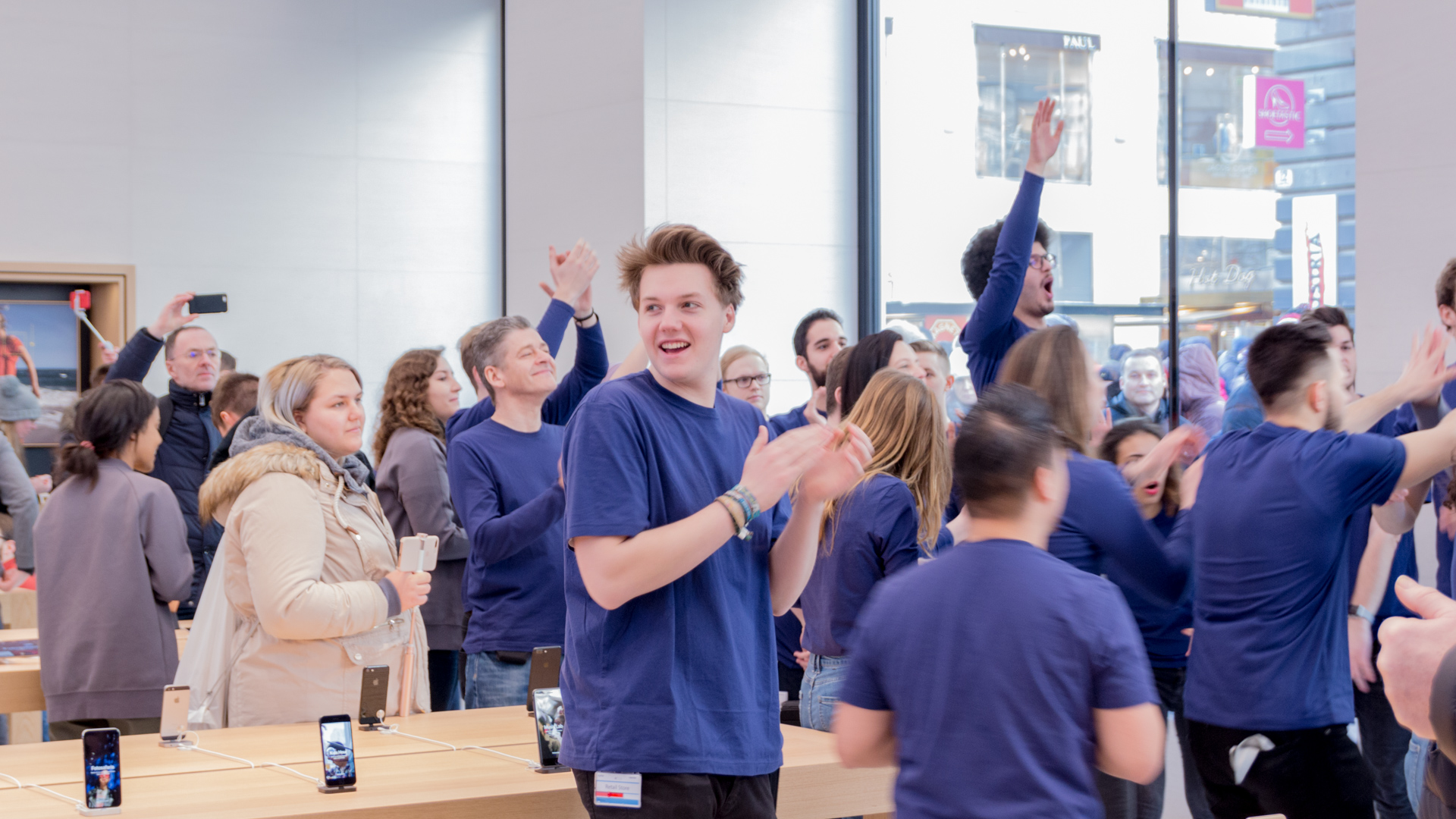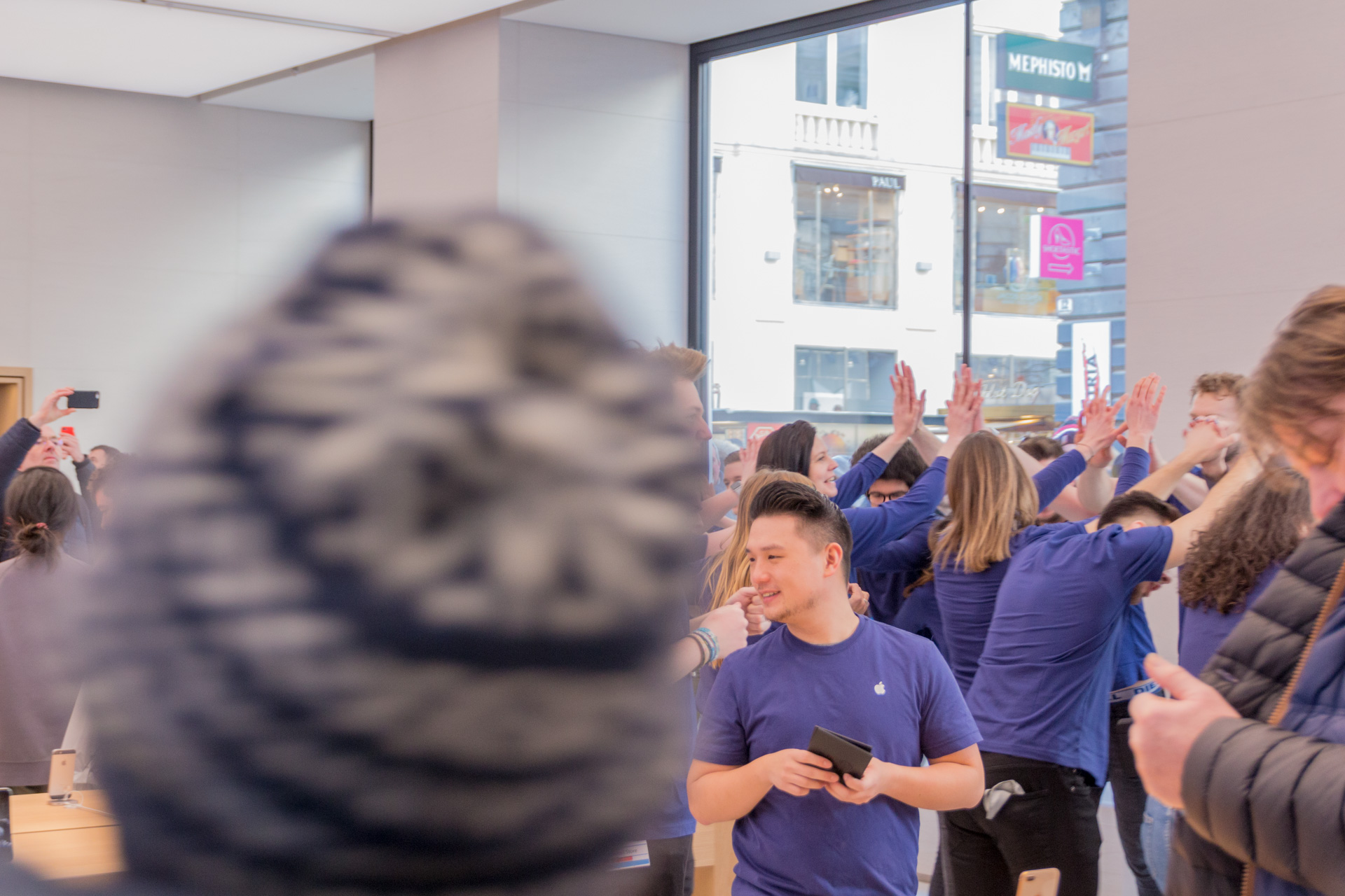 Um 8:00 sind dann die Mitarbeiter im Store erschienen. Uns haben sie zugewunken und es wurden Selfies von den Mitarbeitern gemacht mit den wartenden Menschen im Hintergrund. Etwas später haben die Mitarbeiter zwei Reihen geformt und den Eintritt der ersten Besucher durchgeprobt. Bei den Angestellten herrschte bereits eine ausgelassene Stimmung und man konnte wirklich merken, dass auch diese sich bereits auf die Eröffnung freuen. Immer wieder wurde auch durch die Scheibe gewunken und die Mitarbeiter haben vereinzelt sogar im Store getanzt.