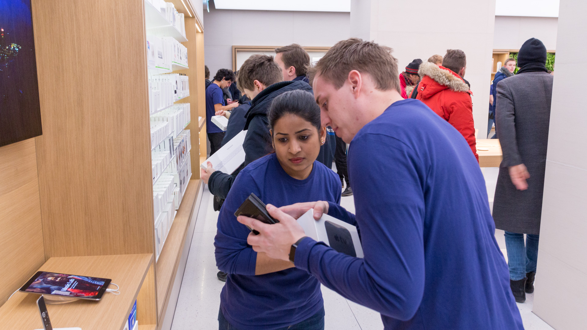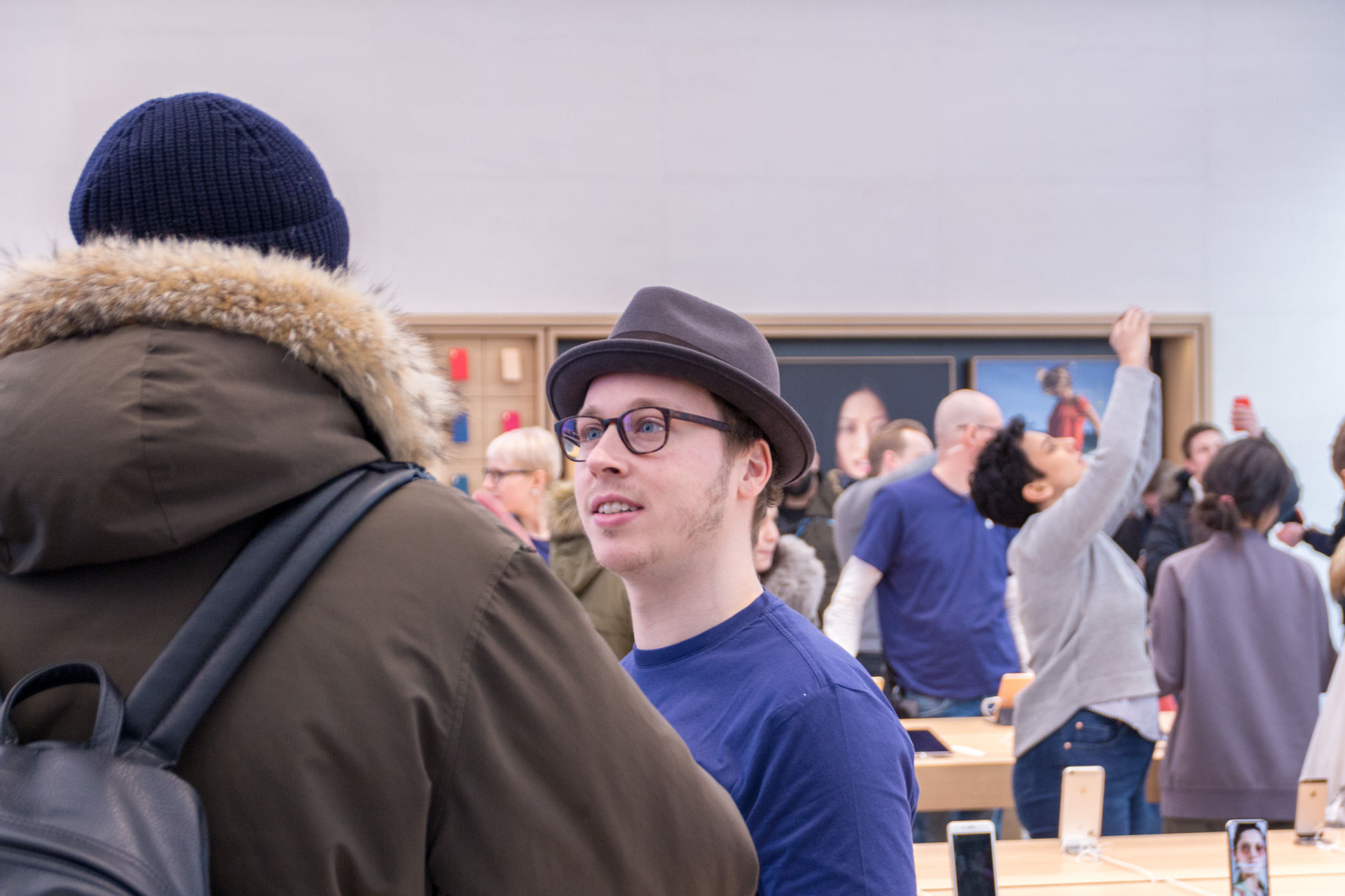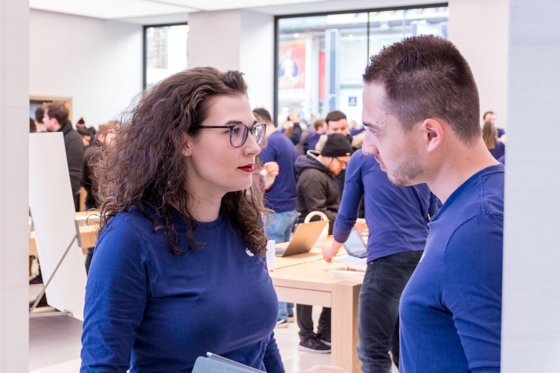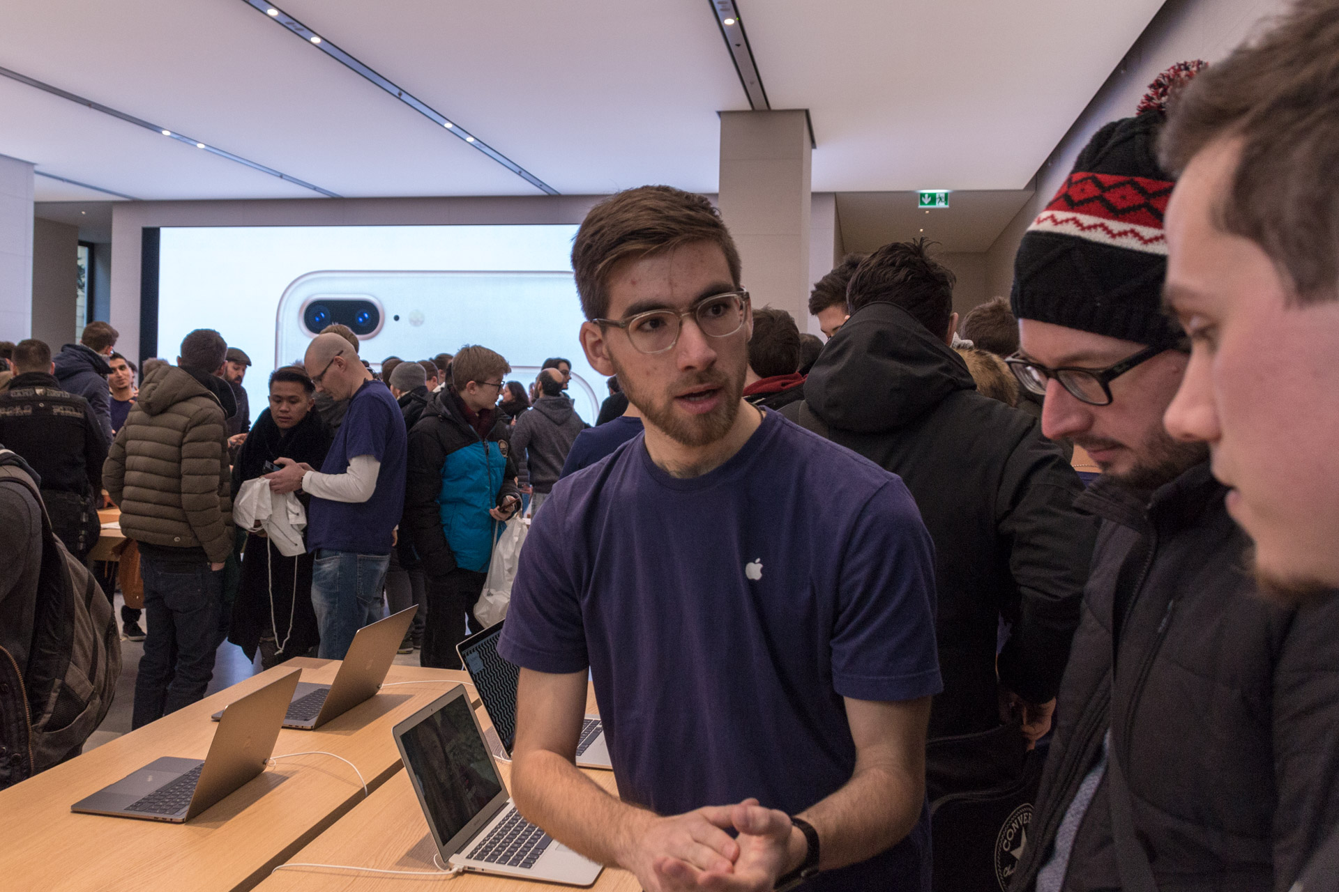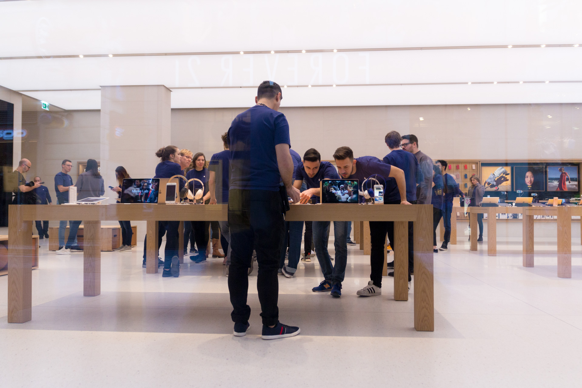 Um 8:00 sind dann die Mitarbeiter im Store erschienen. Uns haben sie zugewunken und es wurden Selfies von den Mitarbeitern gemacht mit den wartenden Menschen im Hintergrund. Etwas später haben die Mitarbeiter zwei Reihen geformt und den Eintritt der ersten Besucher durchgeprobt. Bei den Angestellten herrschte bereits eine ausgelassene Stimmung und man konnte wirklich merken, dass auch diese sich bereits auf die Eröffnung freuen. Immer wieder wurde auch durch die Scheibe gewunken und die Mitarbeiter haben vereinzelt sogar im Store getanzt.