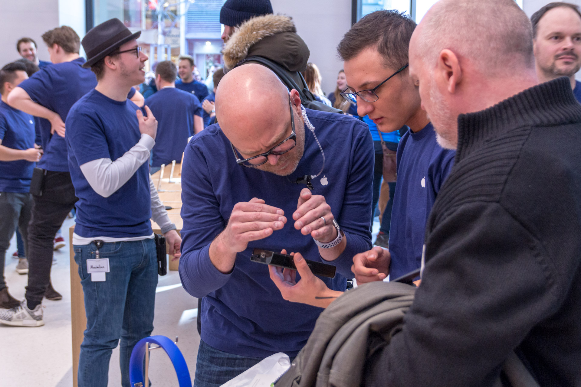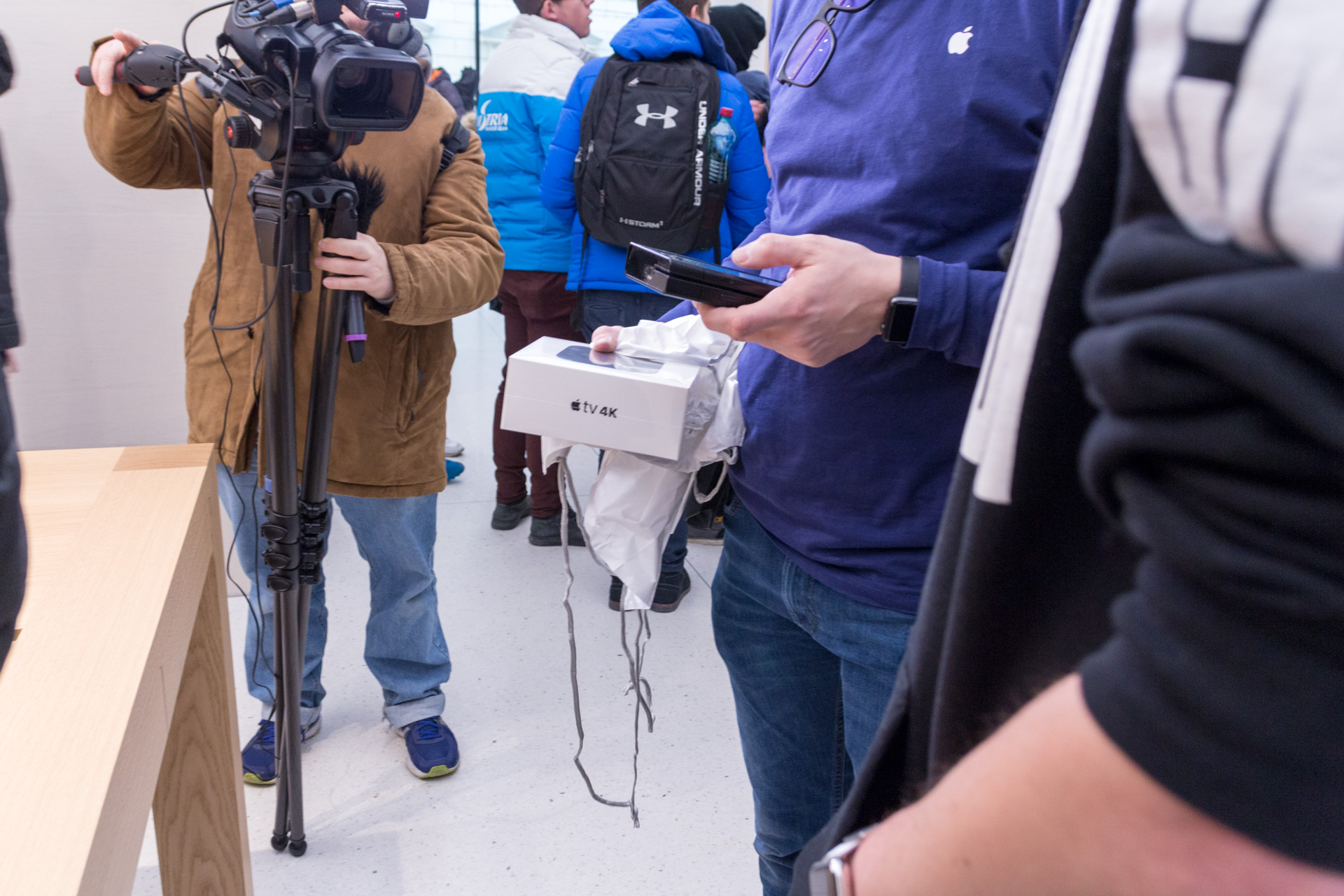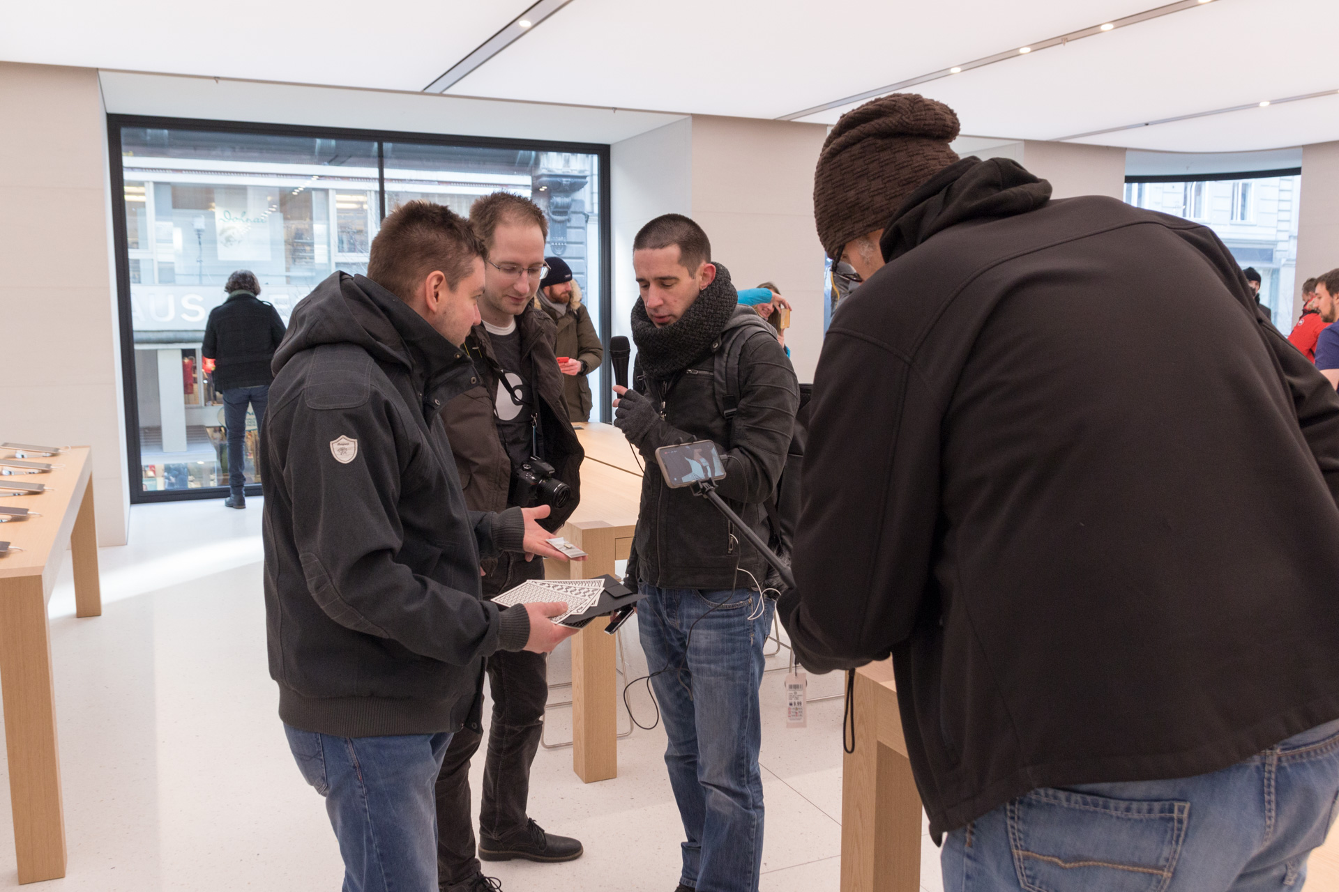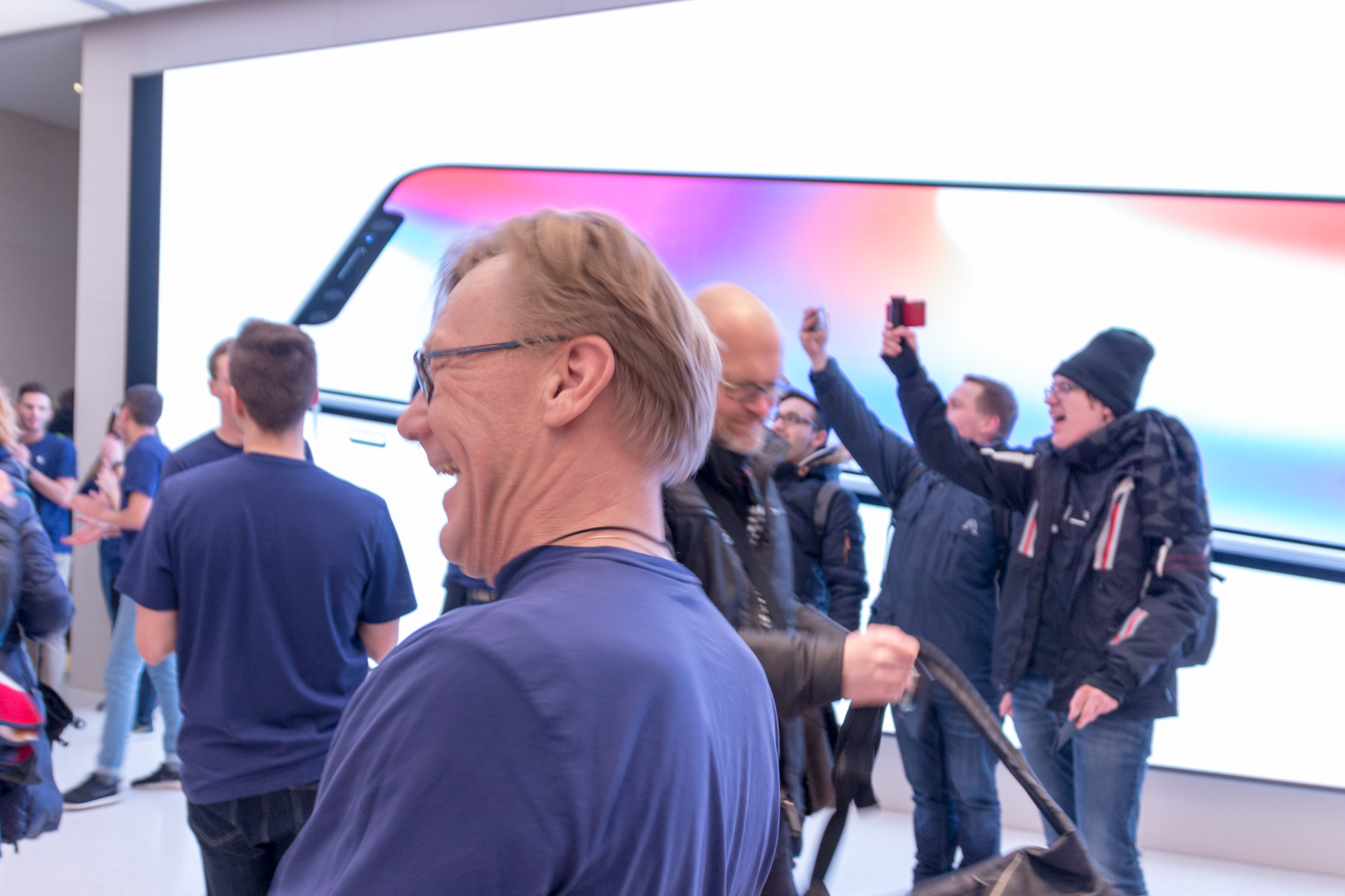 Mein Setup für den Einlass um 9:30 könnt ihr hier sehen: unten meine Canon Kamera mit einem Blitzschuh-Handyhalter und dem iPhone X in der Halterung. Die Kamera dient hierbei für Fotos und das iPhone X nimmt ein 4k Video mit 60fps auf und mit der Kamera kann ich gleichzeitig ein Foto machen. Dadurch, dass das iPhone auf der Kamera fixiert ist, bekommt man auch besser Aufnahmen von oben. Ergibt einen ziemlich coolen Effekt. Später im Store sind dann auch immer wieder Apple Mitarbeiter auf mich zugekommen und wollten eine Auskunft über das Setup haben und haben den Aufbau bewundert. 🙂 Dadurch sind auch einige interessante und coole Gespräche mit Mitarbeitern entstanden.