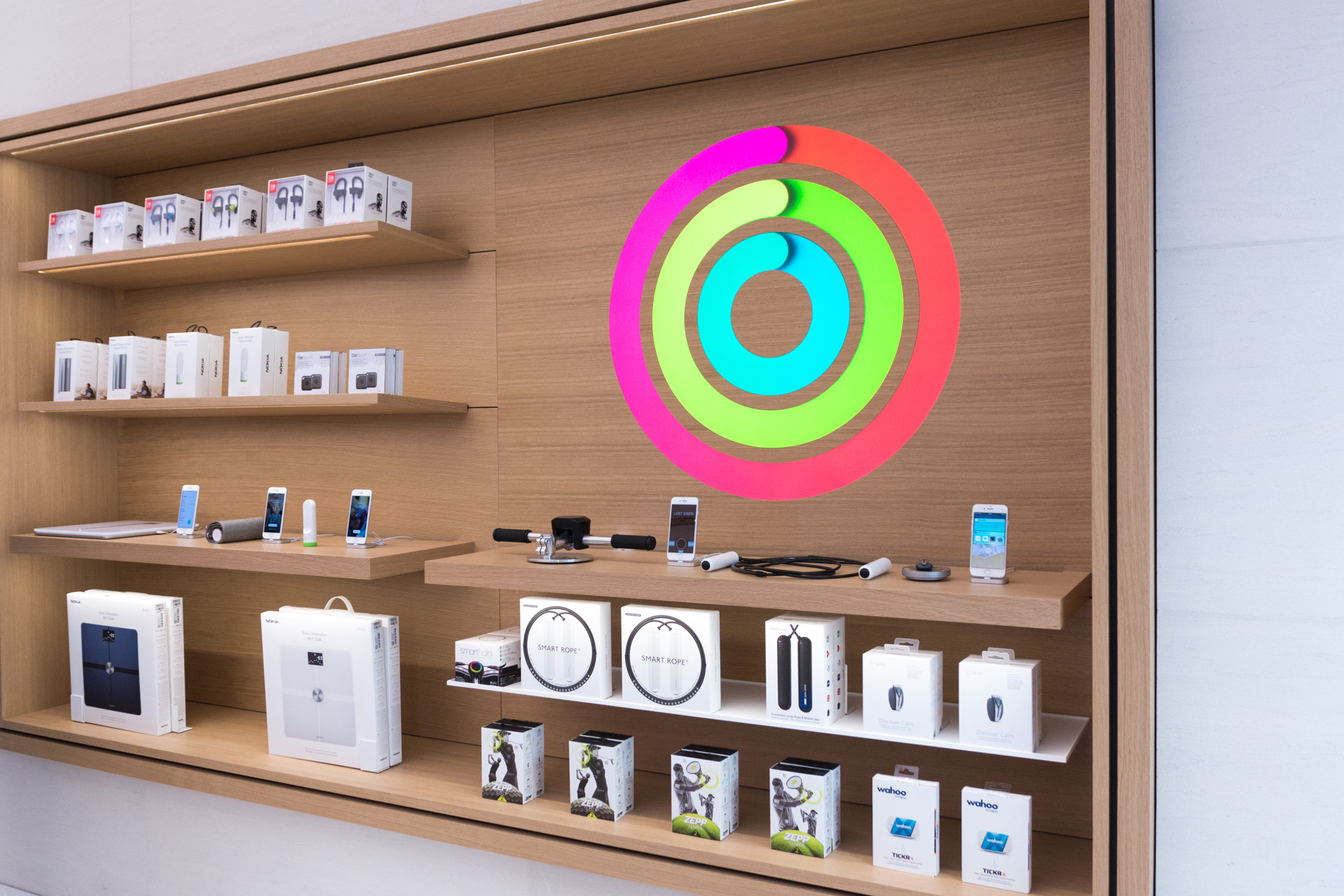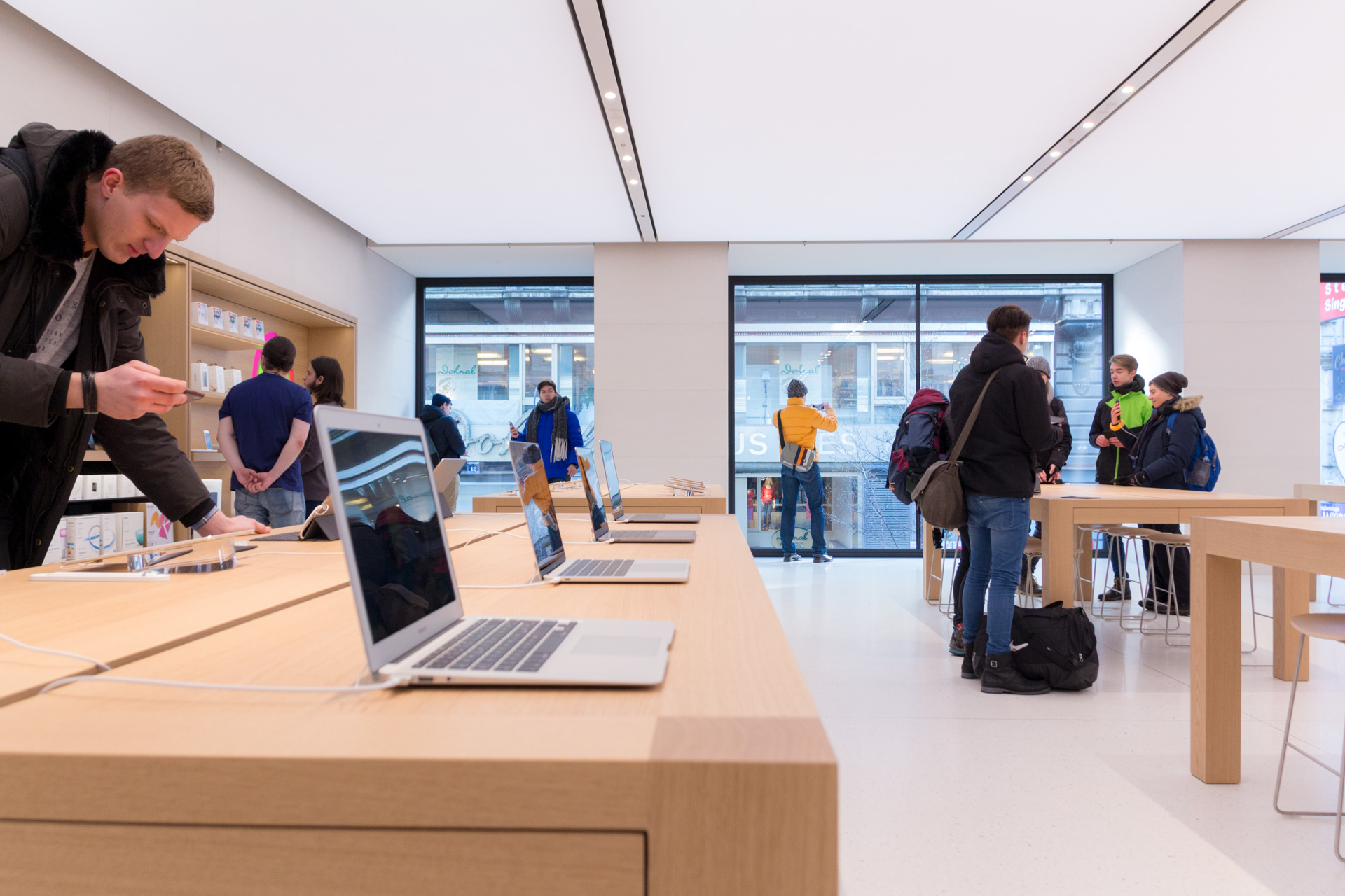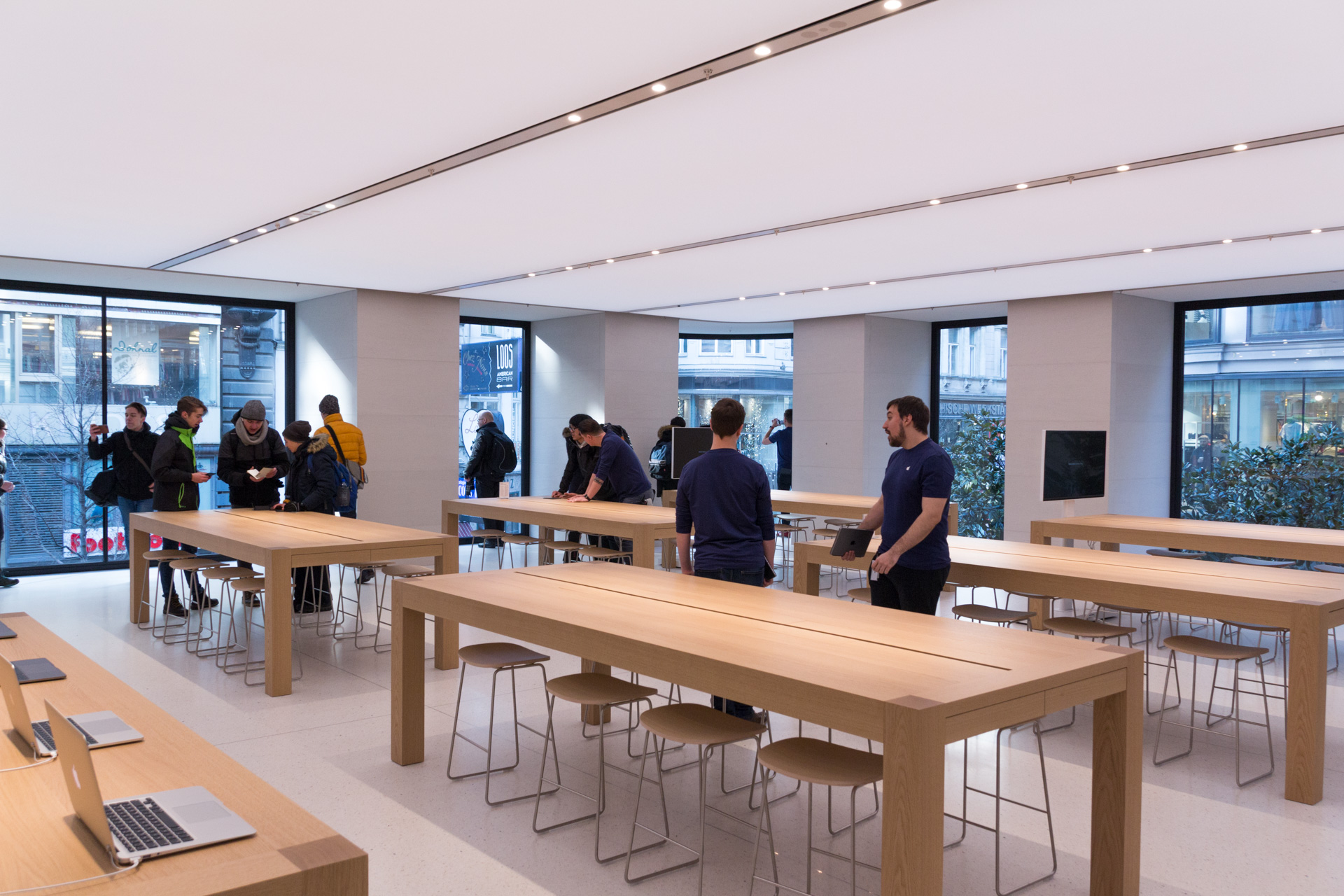 Die obere Etage ist mit Zubehör, Spielzeug, Adaptern/Kabeln, AppleTV und dem Genius Bereich ausgestattet. Im Erdgeschoss befindet sich der Haupt-Verkaufsbereich. iPhones, iPads, Apple Watch, MacBooks/iMacs, Kamerazubehör, Laufsprecher/Kopfhörer und Info Sessions findet man hier vor.