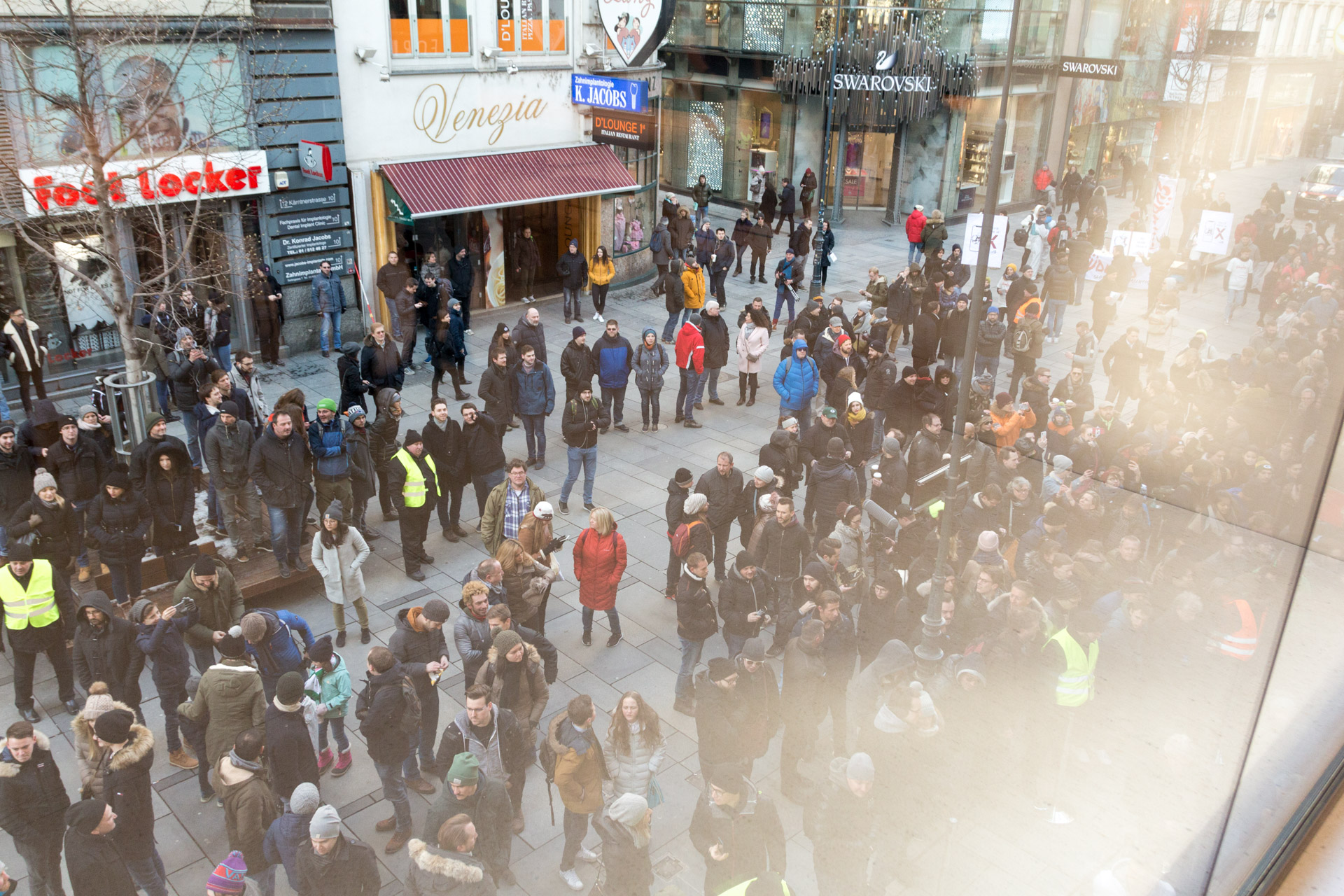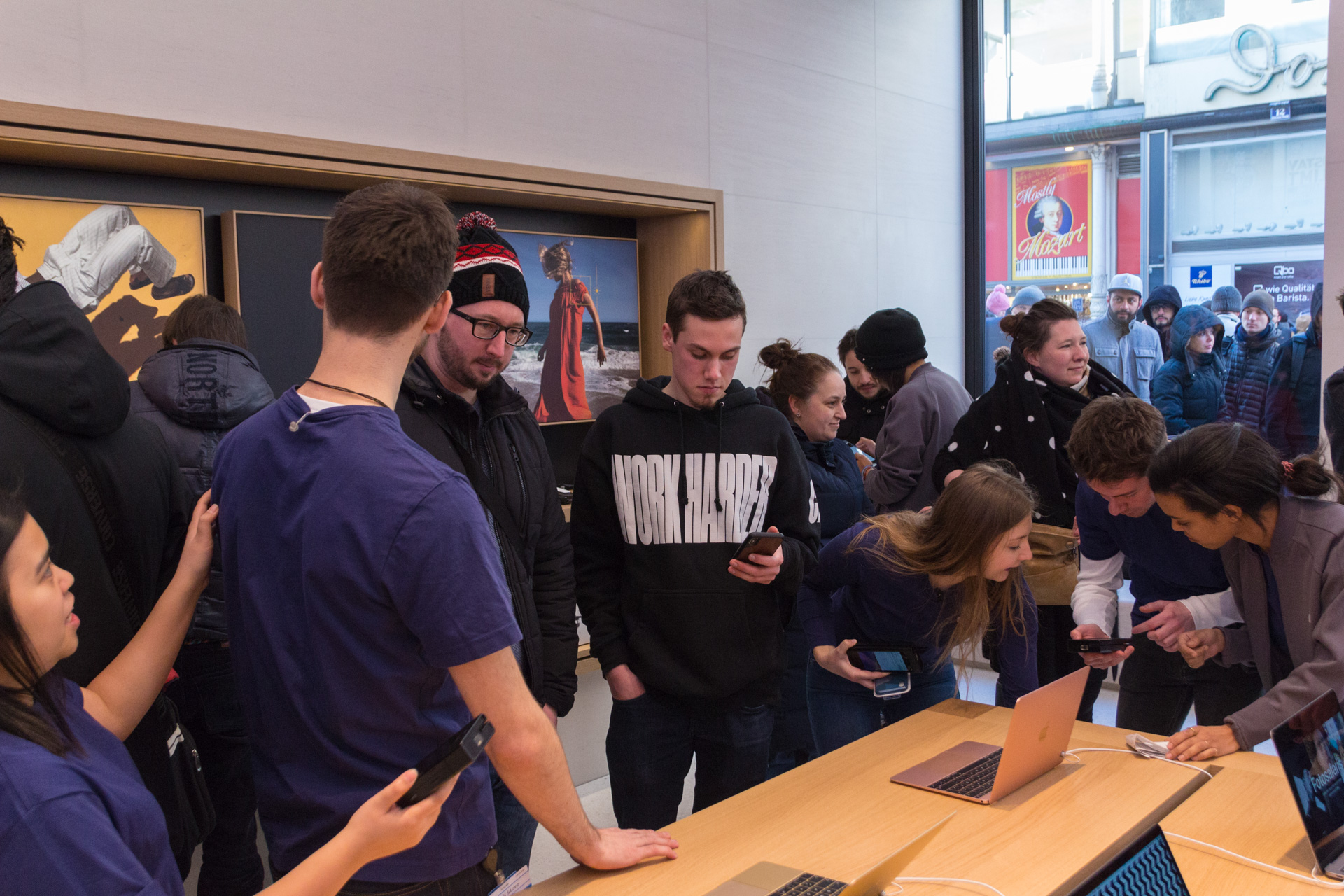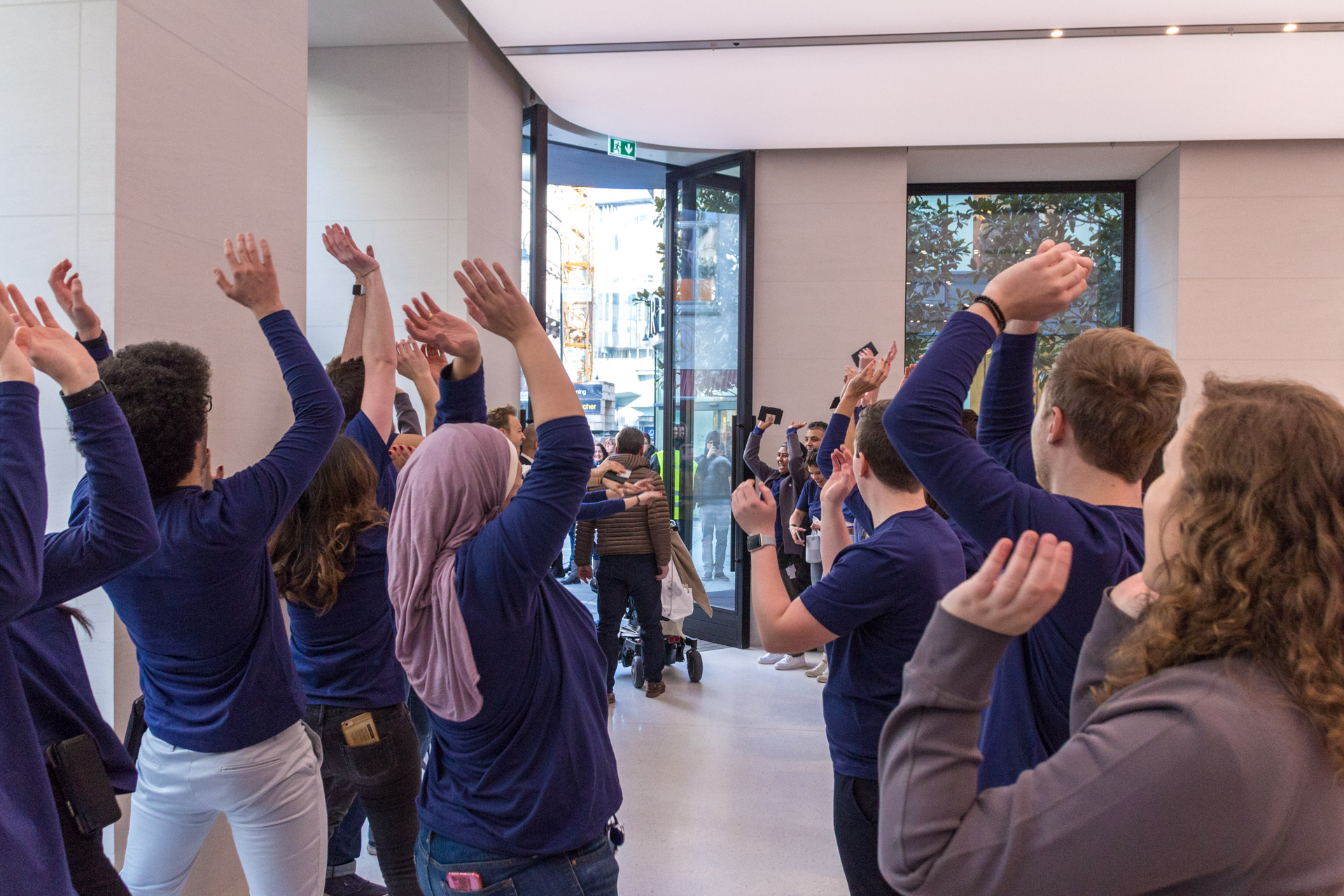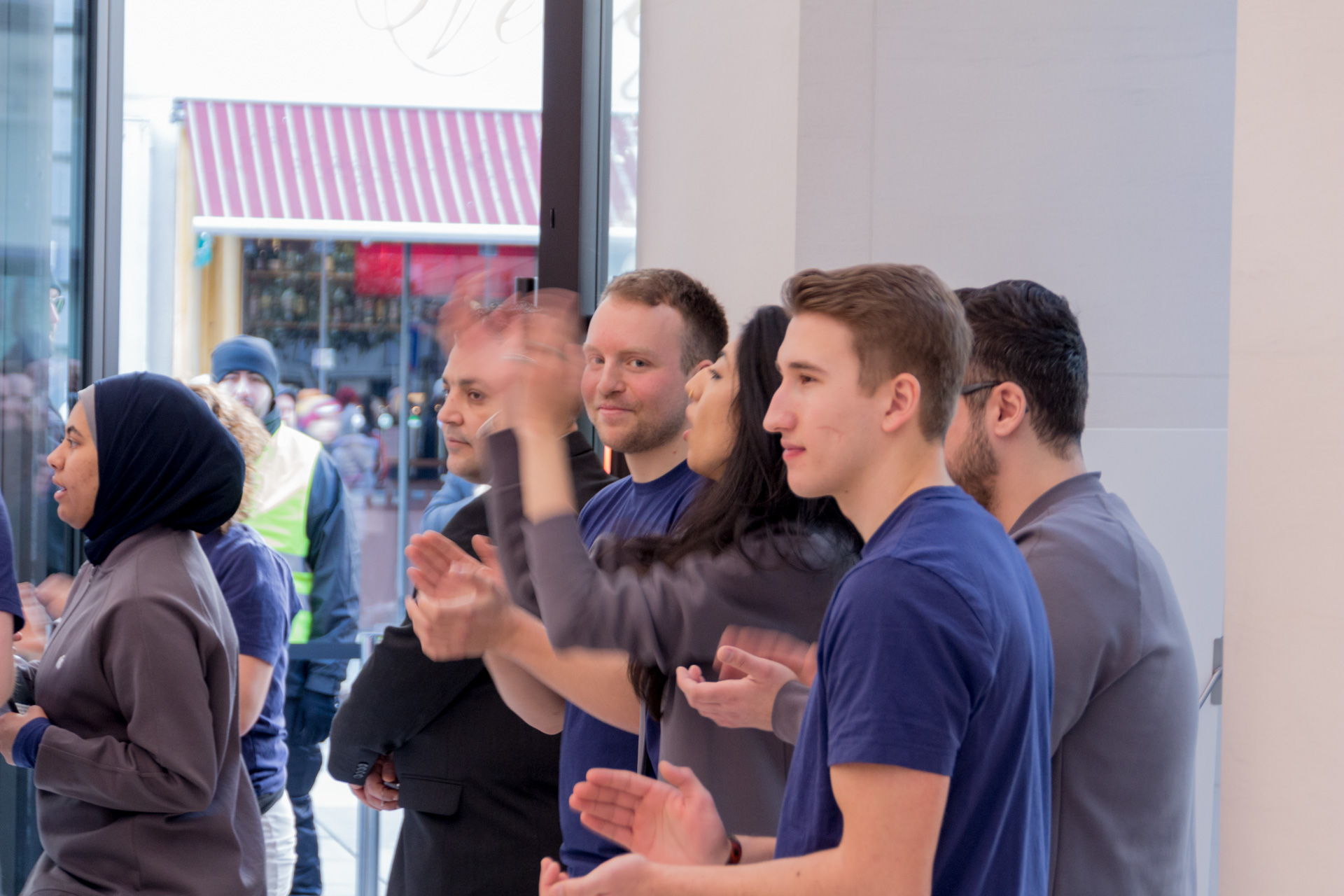 Gegen 9:15 sind Mitarbeiter in Kleien Gruppen aus dem Store gerannt, haben für Stimmung gesorgt und mit den wartenden eingeklatscht. Nachdem eine Gruppe fertig war, ist diese im Store verschwunden und durch die nächste abgelöst worden.